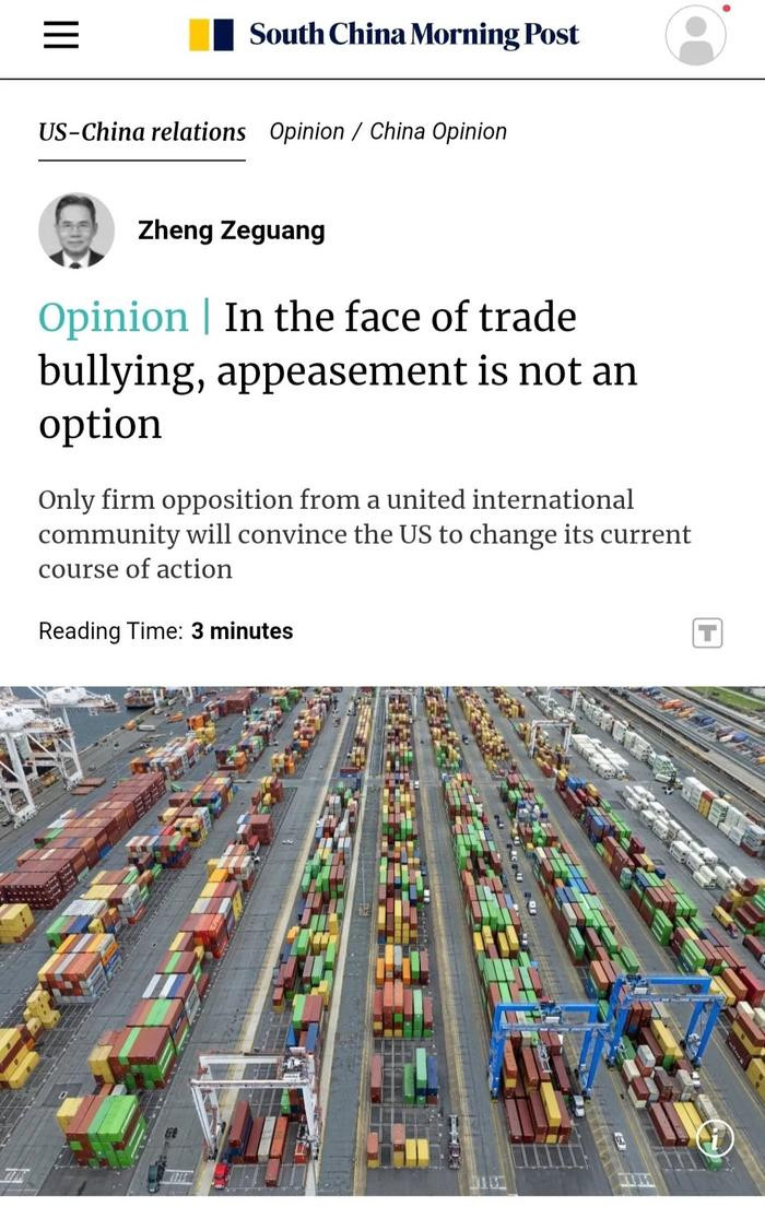 [#我大使发文希望英方站在历史正确的一边#]微信公众号“中国驻英国大使馆”消息,2025年4月27日,中国驻英国大使郑泽光在《南华早报》发表题为《面对贸易霸凌,绥靖绝非选项》的署名文章。郑泽光指出,关税战、贸易战没有赢家。我们不愿打,也不怕打。打,奉陪到底;谈,大门敞开。绥靖妥协只会助长霸凌者的嚣张气焰,坚决反对才能使霸凌者改弦更张。希望英方站在历史正确的一边,站在多边主义和国际合作的一边。